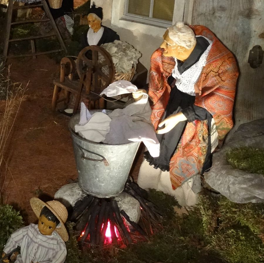 sa quenouille, mais a bien d'autres occupations suivant les circonstances.. - Santon en cire de 75cm de hauteur, réalisé par les carmélites d'Avignon. Mécanisé par un moteur de micro-ondes. Ce santon est habillé également en prophétesse Anne pour la crèche blanche.